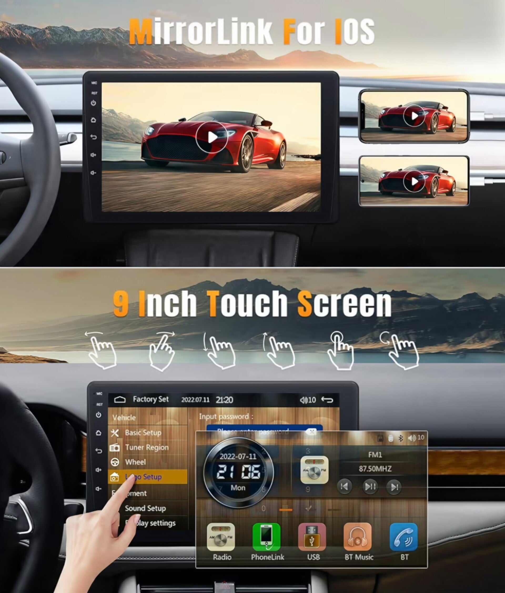 This is a Universal 9 Inch Stereo Single Din Radio with Apple Carplay & Android Auto, Single Din Touchscreen Car Stereo with Bluetooth Car Audio Receivers,Backup Camera,Mirror Link,FM/USB/TF/AUX/Subwoofer